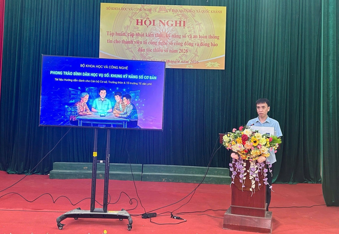Ngày 15/4/2026, Sở Khoa học và Công nghệ phối hợp với UBND xã Quốc Khánh tổ chức Hội nghị tập huấn, cập nhật kiến thức, kỹ năng số và an toàn thông tin cho thành viên Tổ công nghệ số cộng đồng và đồng bào dân tộc thiểu số năm 2026. Tham gia Hội nghị có 204 người, trong đó có 149 người là đồng bào dân tộc thiểu số thuộc 29 Tổ Công nghệ số cộng đồng của xã và 55 công chức cấp xã.