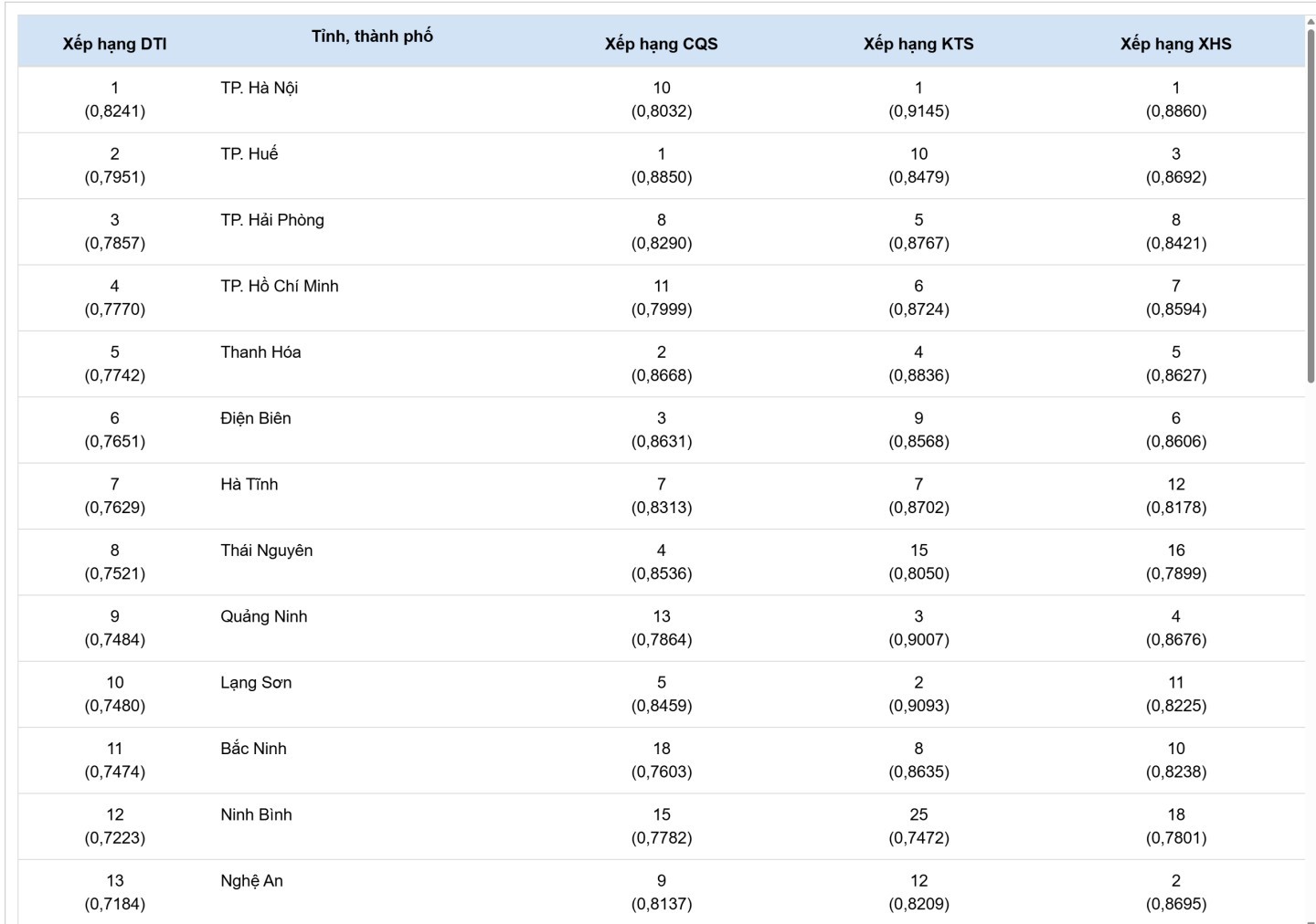 Bảng xếp hạng chỉ số DTI năm 2024 (Ảnh chụp màn hình DTI.GOV.VN)