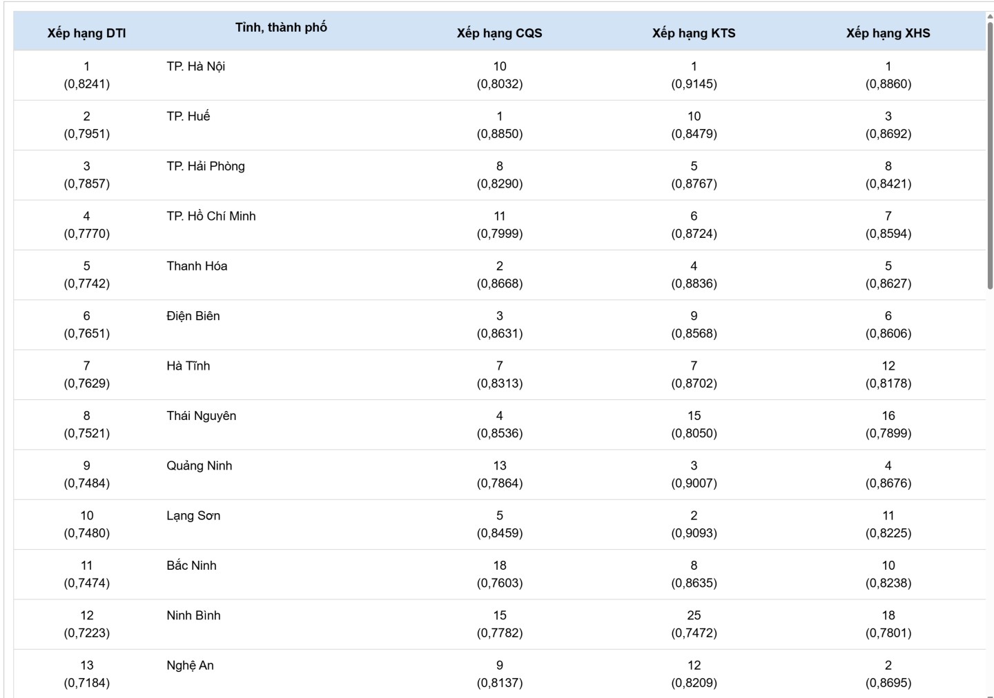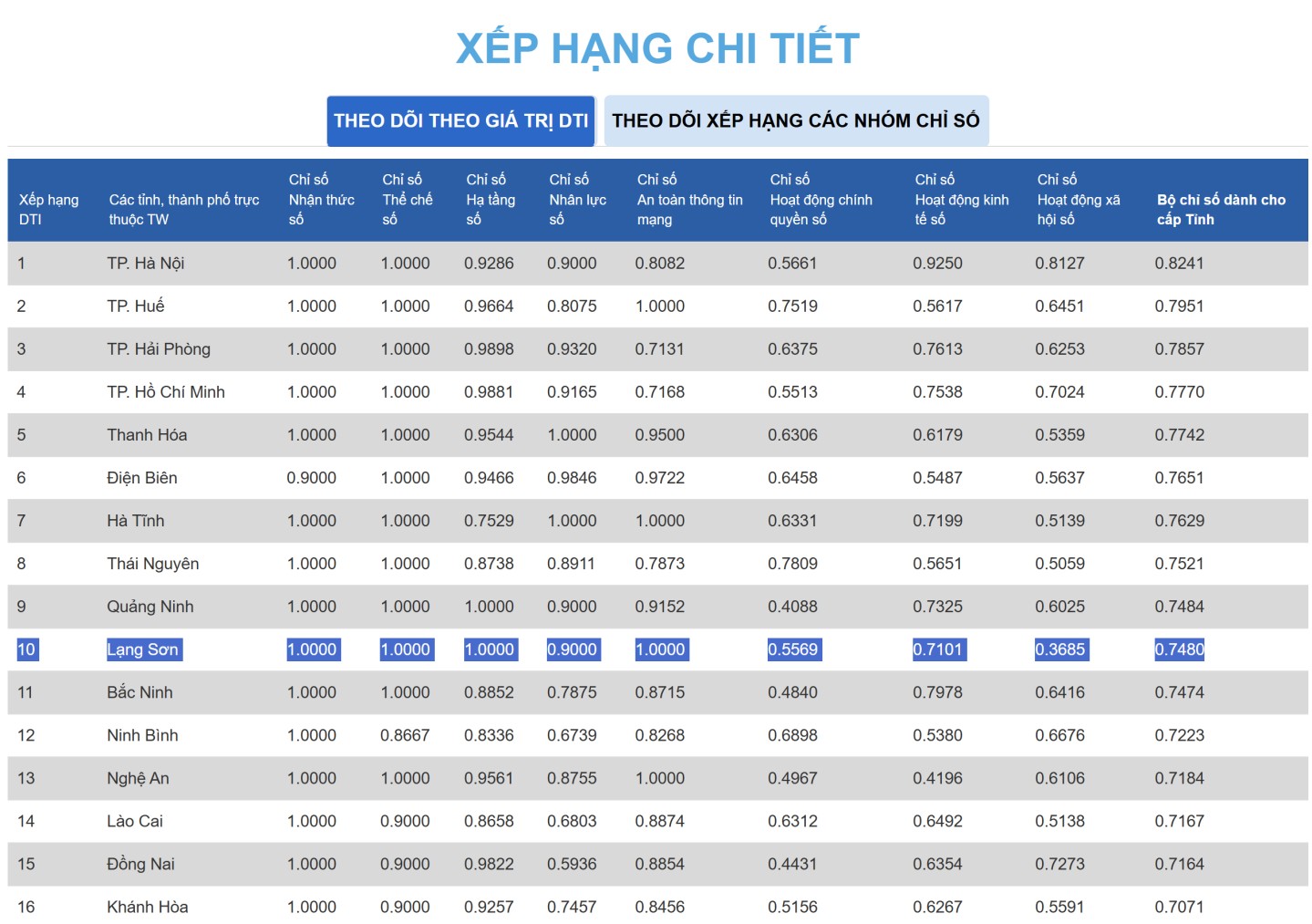 Theo kết quả công bố, tỉnh Lạng Sơn có chỉ số DTI đứng thứ 10/34 tỉnh, thành trong bảng xếp hạng.