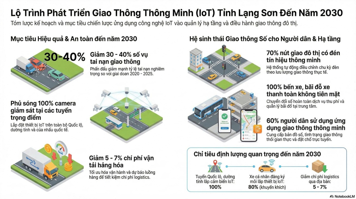 Phấn đấu đến năm 2030: 100% các tuyến Quốc lộ, đường tỉnh trọng điểm, cửa ngõ ra vào tỉnh, khu du lịch, cửa khẩu quốc tế Hữu Nghị được lắp đặt hệ thống camera giám sát, cảm biến IoT và kết nối về Trung tâm điều hành giao thông; ít nhất 70% nút giao thông chính trong các đô thị được lắp đặt đèn tín hiệu thông minh, có khả năng điều chỉnh chu kỳ theo lưu lượng thực tế. Phát triển và đưa vào sử dụng ứng dụng di động giao thông thông minh tỉnh Lạng Sơn, cung cấp bản đồ số, tình trạng giao thông thời gian thực, thông tin bãi đỗ xe, vận tải công cộng, khuyến cáo lộ trình; mục tiêu ít nhất 60% người dân tại các đô thị thường xuyên sử dụng dịch vụ tra cứu, tương tác với hệ thống giao thông thông minh; phấn đấu 100% bến xe, bãi đỗ xe tại trung tâm tỉnh áp dụng quản lý bằng công nghệ số, thanh toán điện tử không dùng tiền mặt; triển khai thực hiện thu phí không dừng theo quy định. Giảm khoảng 30 - 40% số vụ tai nạn giao thông nghiêm trọng so với giai đoạn 2020 - 2025; tăng hiệu quả vận hành và tiết kiệm chi phí logistics nhờ áp dụng giám sát hành trình, dự báo luồng hàng hóa, phấn đấu giảm chi phí vận tải hàng hóa qua địa bàn tỉnh từ khoảng 5 - 7%...