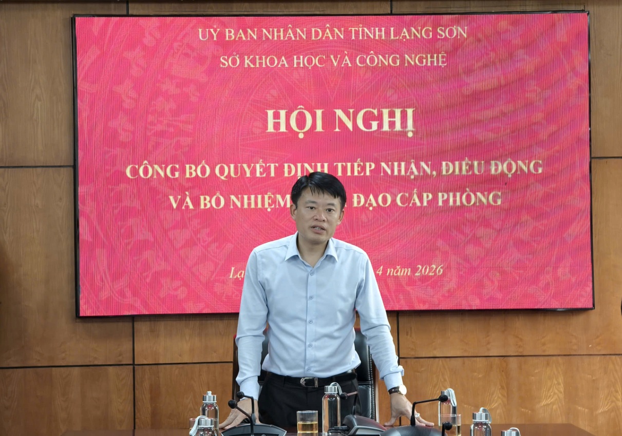 Chiều 15/4/2026, Sở Khoa học và Công nghệ (KH&CN) đã tổ chức Hội nghị công bố Quyết định tiếp nhận, điều động và bổ nhiệm lãnh đạo cấp phòng. Dự Hội nghị có đồng chí Nguyễn Quang Huy, Tỉnh ủy viên, Giám đốc Sở; các đồng chí Phó Giám đốc Sở; lãnh đạo các phòng, đơn vị trực thuộc Sở.