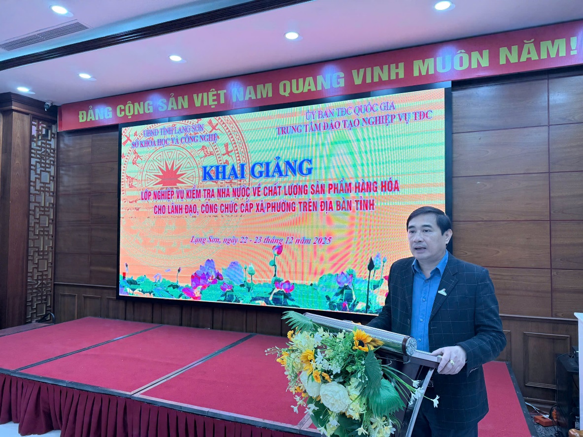 Thực hiện Kế hoạch số 195/KH-UBND ngày 19/07/2025 của UBND tỉnh về việc tổ chức các lớp bồi dưỡng, tập huấn chuyên môn nghiệp vụ cho đội ngũ cán bộ, công chức của chính quyền địa phương 2 cấp. Ngày 22/12/2025, Sở Khoa học và Công nghệ tỉnh Lạng Sơn phối hợp với Trung tâm Đào tạo Nghiệp vụ Tiêu chuẩn Đo lường Chất lượng thuộc Ủy ban Tiêu chuẩn Đo lường Chất lượng Quốc gia tổ chức khai giảng Khóa tập huấn nghiệp vụ kiểm tra Nhà nước về chất lượng sản phẩm, hàng hóa cho đội ngũ cán bộ cấp xã, phường trên địa bàn tỉnh.