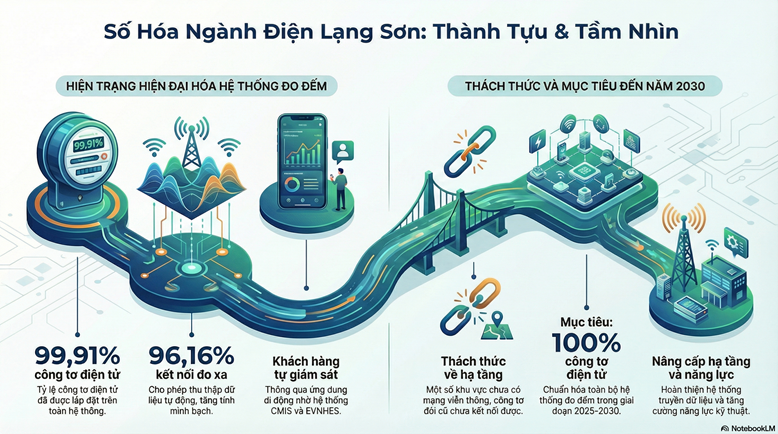 Công ty Điện lực Lạng Sơn hiện đạt tỷ lệ 99,91% công tơ điện tử, trong đó 96,16% được kết nối đo xa, thu thập dữ liệu tự động. Công tác kiểm định, đối chứng 10% công tơ hàng năm được duy trì nghiêm túc. Việc ứng dụng hệ thống CMIS, EVNHES giúp minh bạch hóa chỉ số, tạo điều kiện cho khách hàng tự giám sát chỉ số điện thông qua ứng dụng.
