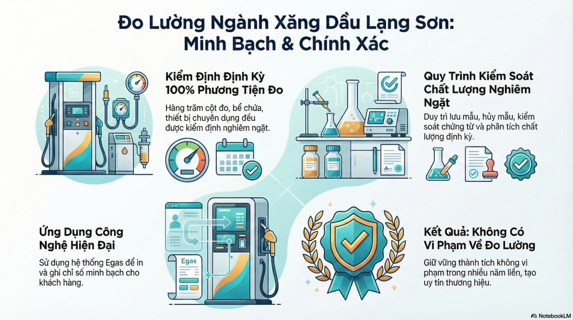 Công ty TNHH MTV Petrolimex Lạng Sơn với quy mô hơn 150 cửa hàng xăng dầu, sở hữu hàng trăm cột đo, bể chứa, thiết bị đo chuyên dụng. Tất cả đều được kiểm định định kỳ theo quy định, đảm bảo tính chính xác trong giao dịch – lĩnh vực vốn rất nhạy cảm về đo lường.