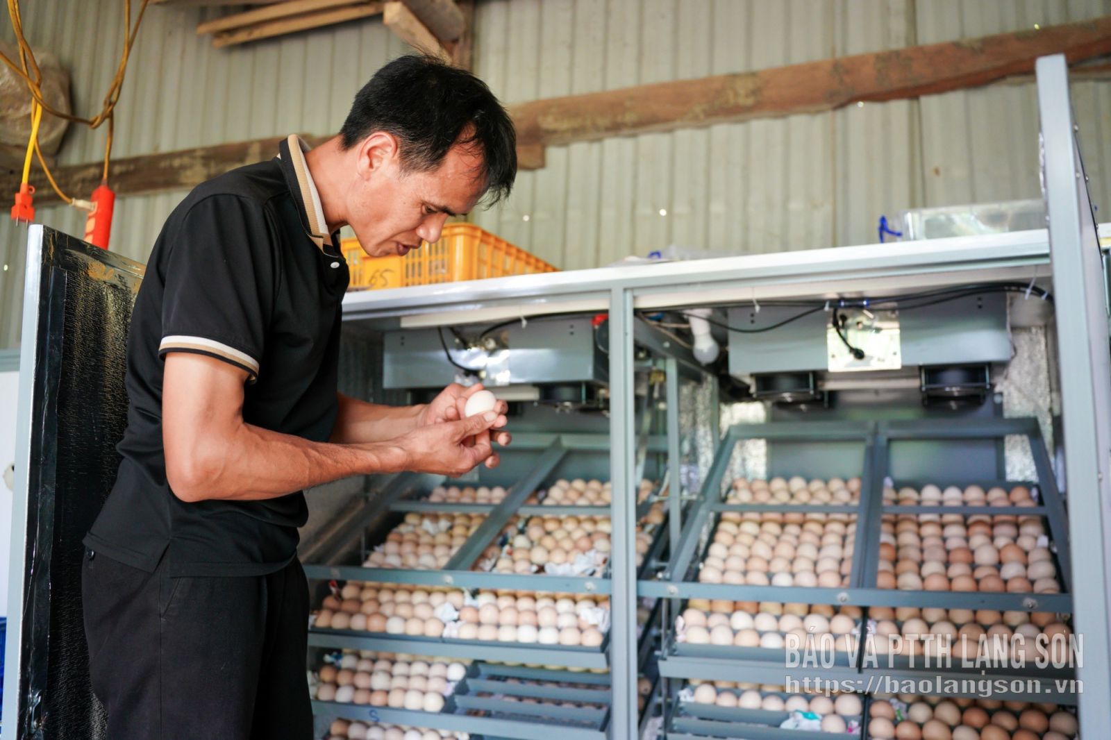 Cùng chung hướng đi, anh Lương Văn Trẻ, thôn Nà Tẻn đã mạnh dạn đầu tư hệ thống máy ấp trứng, đồng thời chú trọng áp dụng đệm lót sinh học trong chăn nuôi. Anh chia sẻ: Từ khi tham gia dự án nghiên cứu, ứng dụng khoa học công nghệ nhằm phục tráng và phát triển bền vững sản phẩm gà Vạn Linh, tôi được hướng dẫn lựa chọn, xây dựng đàn gà “hạt nhân”. Trước đây, gia đình phải mua con giống bên ngoài nên chi phí cao, chất lượng không đồng đều, nay nhờ tôi tự chủ được con giống với tỷ lệ nở đạt trên 95%. Không chỉ phục vụ chăn nuôi của gia đình, tôi còn cung cấp con giống cho các hộ khác.